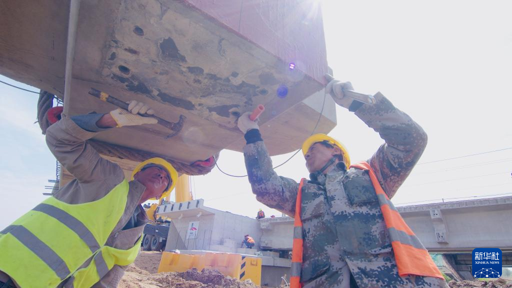 5月19日,工人在沈山铁路鸭子河中桥新建大桥架梁工程现场施工。