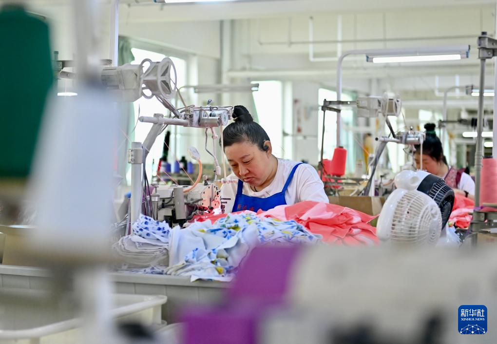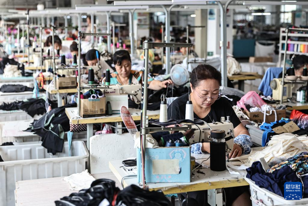 7月15日,工作人员在兴城一家泳装企业生产车间缝制泳衣。