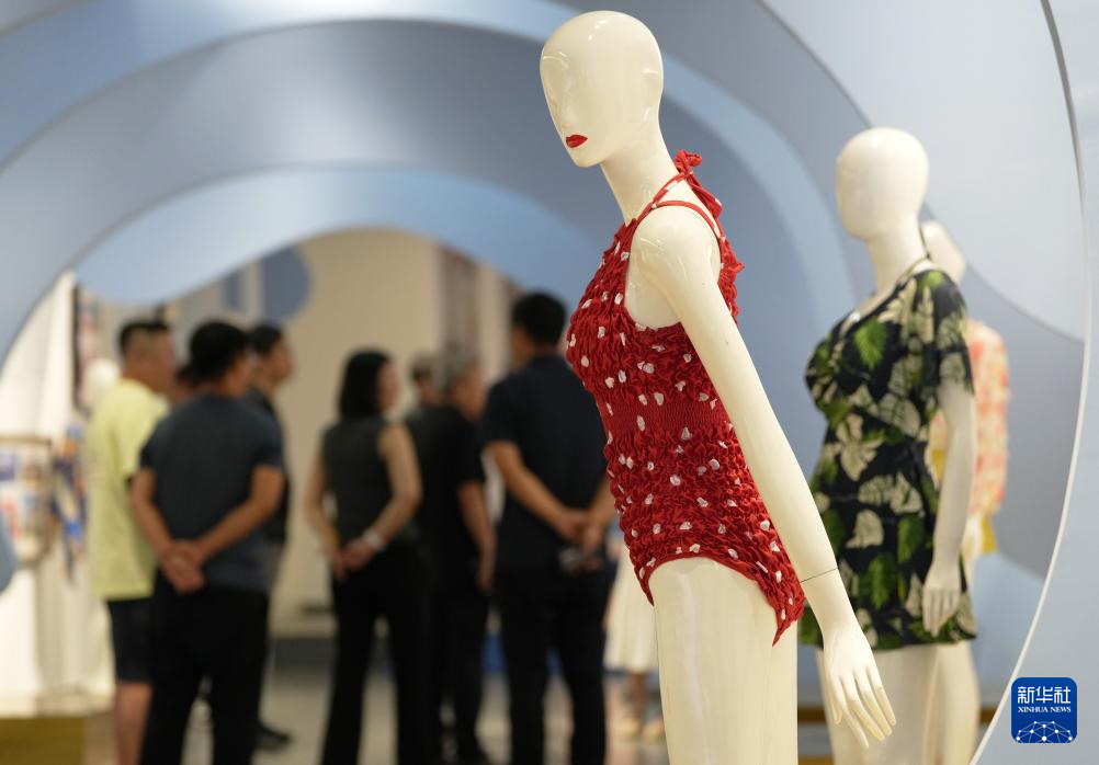 7月15日,工作人员在葫芦岛斯达威体育用品有限公司泳装展示间整理泳装样品。