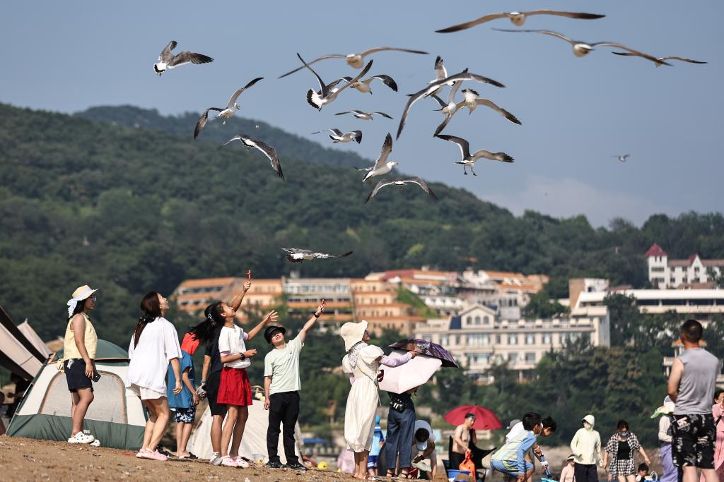 2025年7月10日游客在大连傅家庄公园海滨沙滩投喂海鸥。新华社记者 潘昱龙 摄