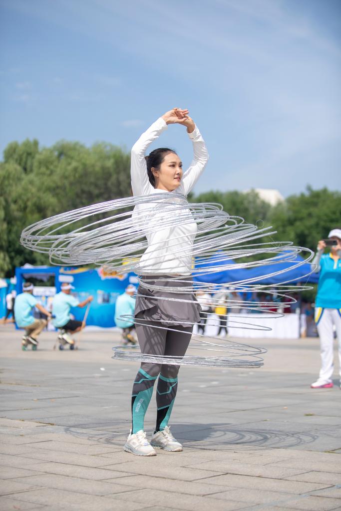 为满足群众多元化健身需求,活动现场设置霹雳舞、广场舞、少儿跆拳道展演、花式跳绳、趣味毽球、速度轮滑、独轮车、徒步走、篮球、抖空竹、健身操等展演活动,吸引近800人参与,年龄最小的仅有5岁,最年长的近70岁。此外,现场还设置国民体质监测、科学健身指导、体育法宣传、体彩即开票销售等活动。
