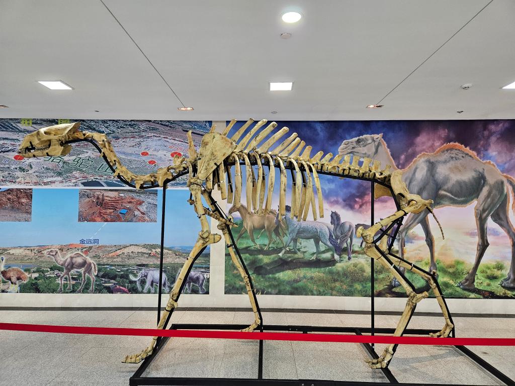 新华社沈阳8月31日电(记者于也童、张博群)走进位于大连市金普新区复州湾街道的一处工作室,一副高3.4米、宽1.5米、长4.5米的金普巨副骆驼骨架标本引人注目。身高1.76米的记者在它身下抬起头,只能看到这只巨兽的下颌骨。庞大的体型、微黄的骨骼,让它看起来与工作室内的现代文明有些“格格不入”。
