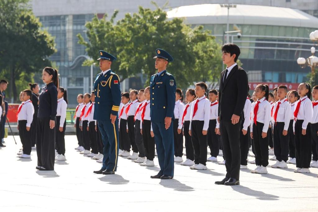 9月12日,杨倩(前排左一)参加在沈阳市人民广场举行的“强国复兴有我 争当新时代好少年”升旗仪式。图片来自共青团沈阳市委员会